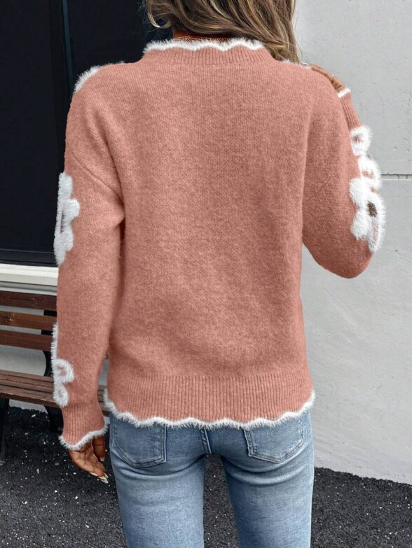 Pulover Tricotat Alexia Roz cu Flori Albe