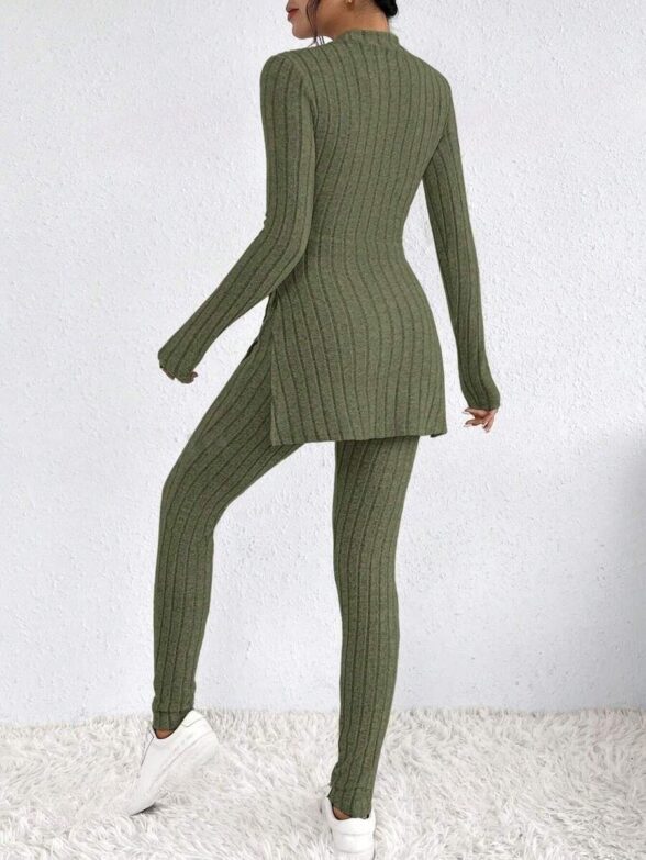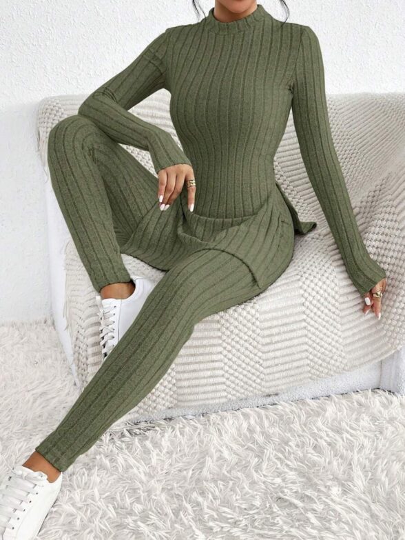 Prețul inițial a fost: 435,00 lei.174,00 leiPrețul curent este: 174,00 lei.Compleu Tricotat cu Pantalon Suzan Verde cu Dungi Albe