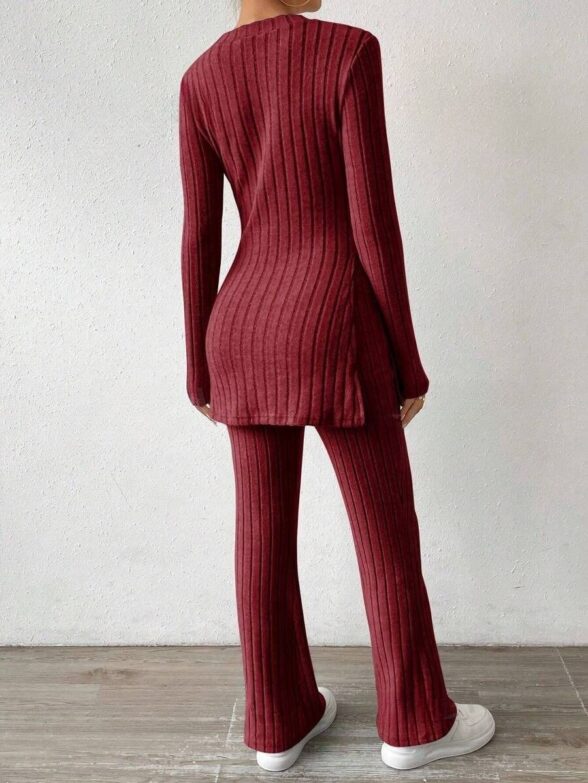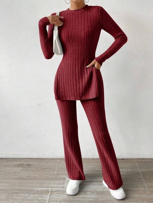 Compleu cu Pantalon Esra Grena cu Print Geometric Negru – Marimi Mari