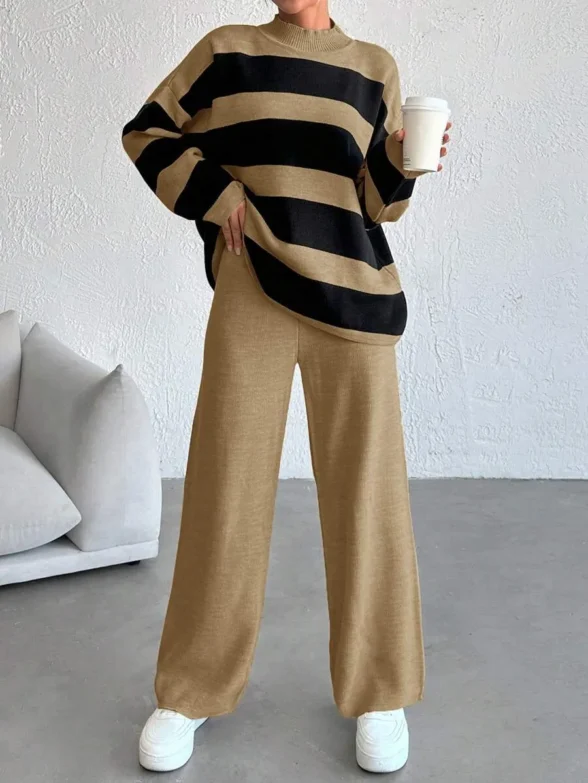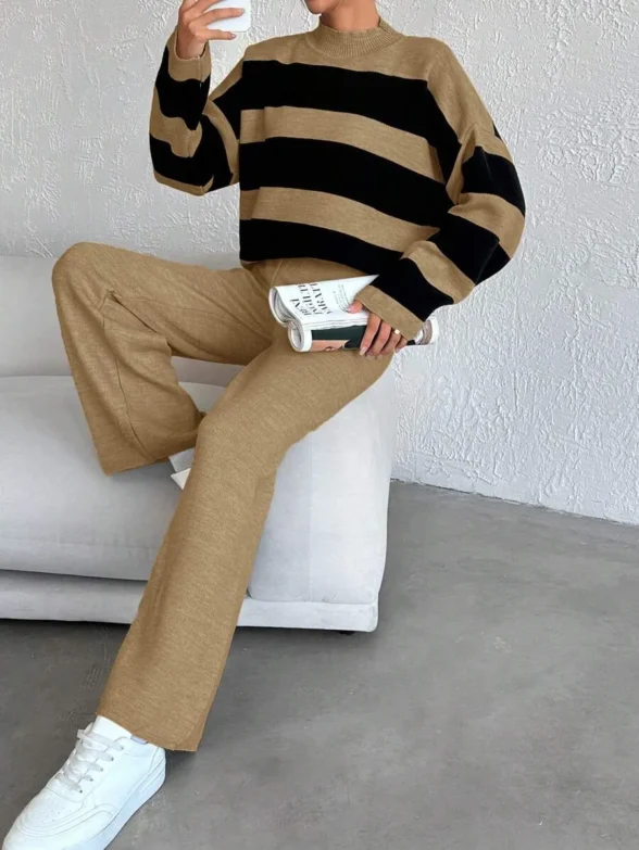 Compleu Tricotat cu Pantalon Emily Crem cu Dungi Negre