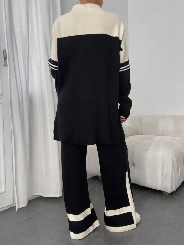 Compleu Tricotat cu Pantalon Simona Negru cu Dungi Albe