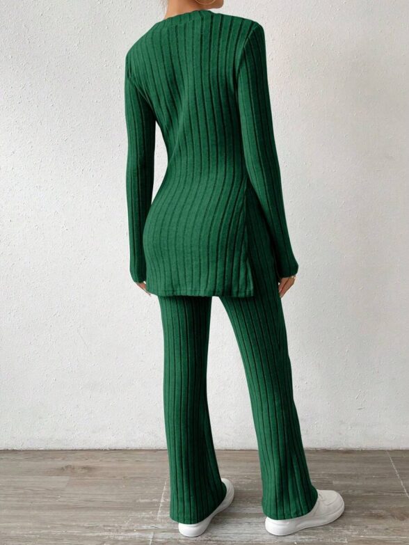 Prețul inițial a fost: 435,00 lei.174,00 leiPrețul curent este: 174,00 lei.Compleu Tricotat cu Pantalon Suzan Verde cu Dungi Albe