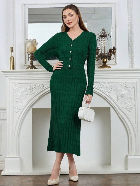 Compleu Tricotat cu Fusta Midi Rebeca Verde