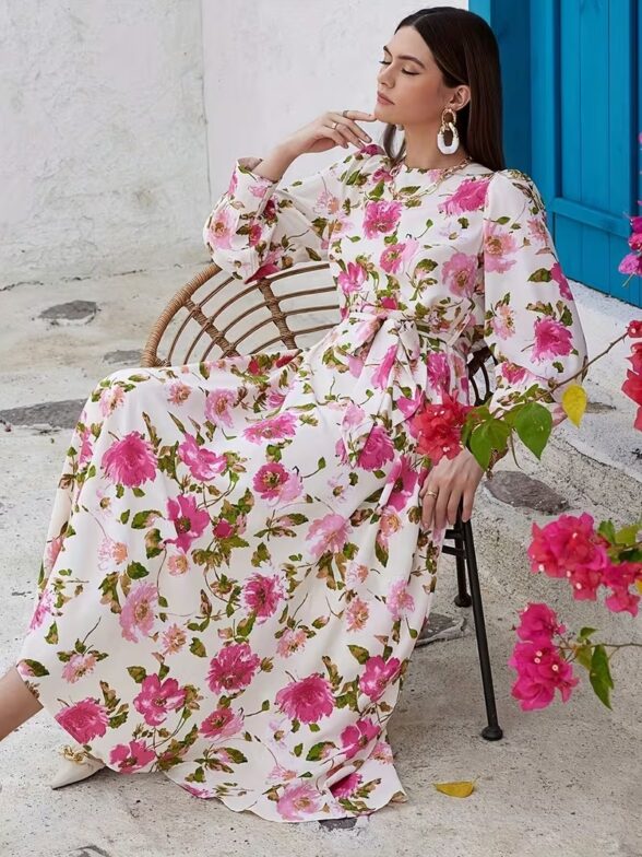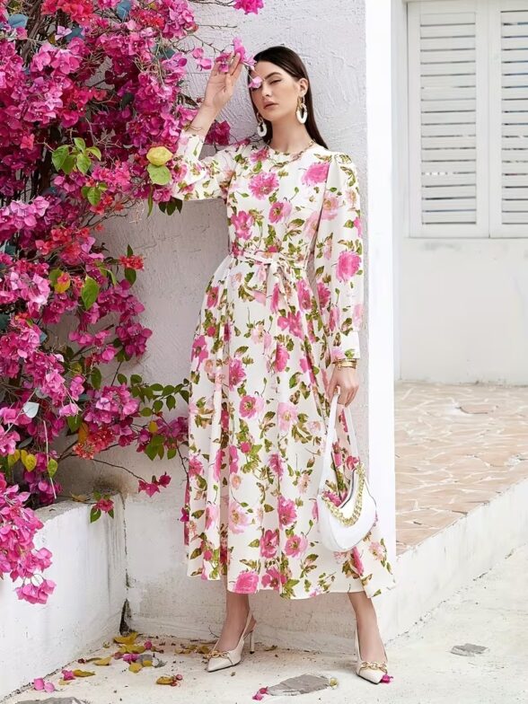Rochie Lunga Simina Alba cu Print Floral Roz
