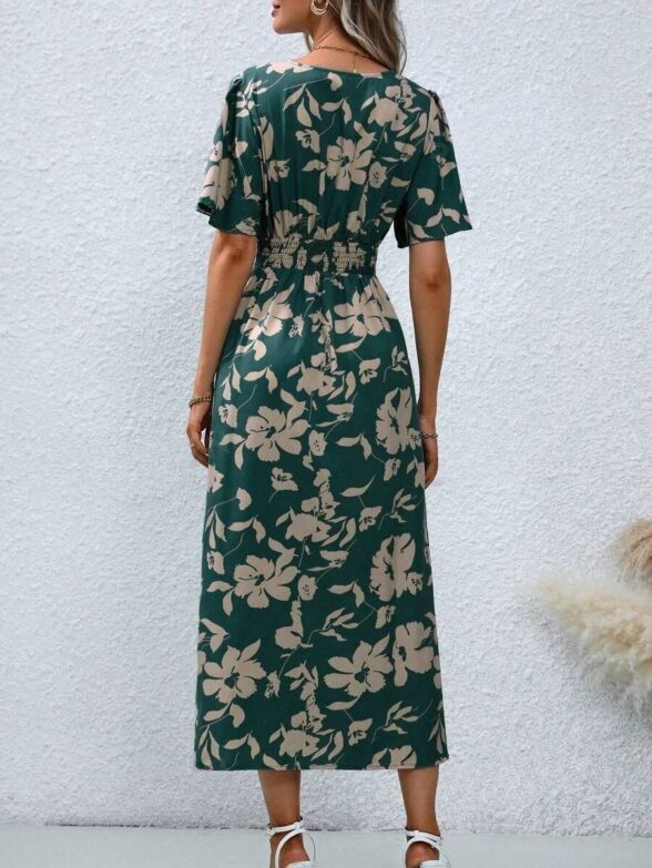 Rochie Scurta Abigaille Verde Cu Model Floral Si Maneci Bufante
