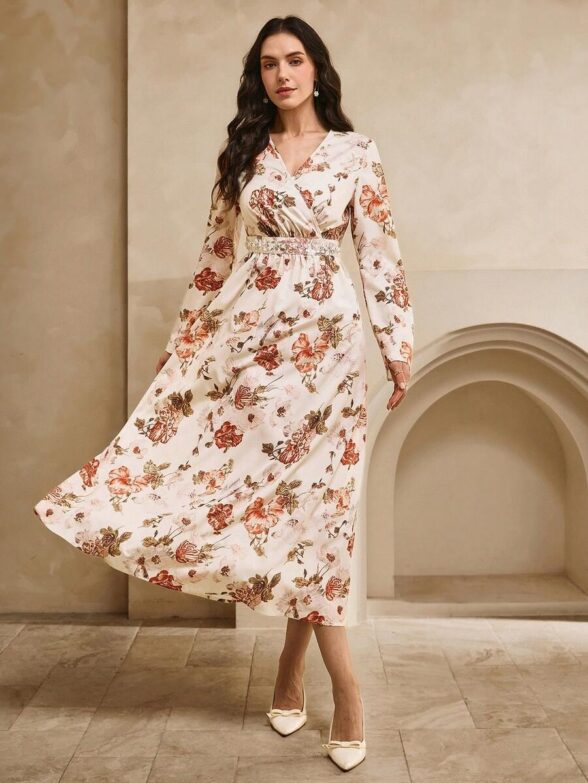 Rochie Lunga Amedee Crem cu Print Floral Multicolor