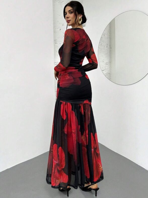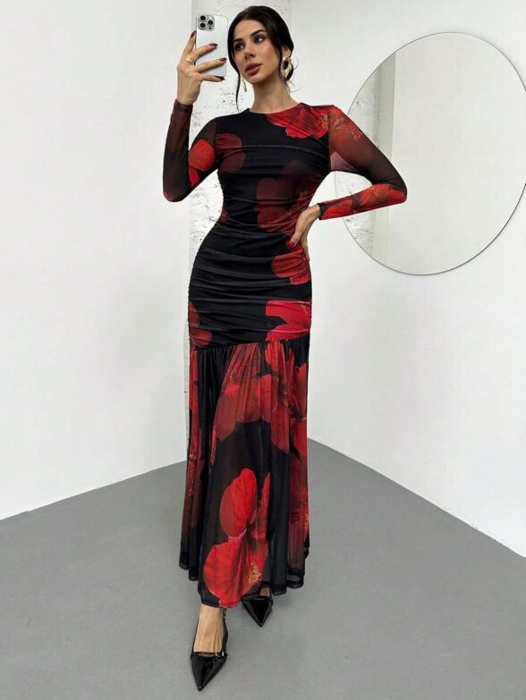 Rochie Lunga Malibu Neagra cu Print Floral Rosu