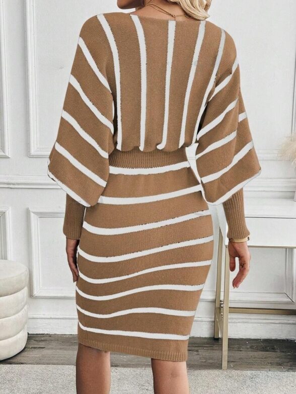 Rochie Scurta Tricotata Nelly Bej cu Dungi Albe