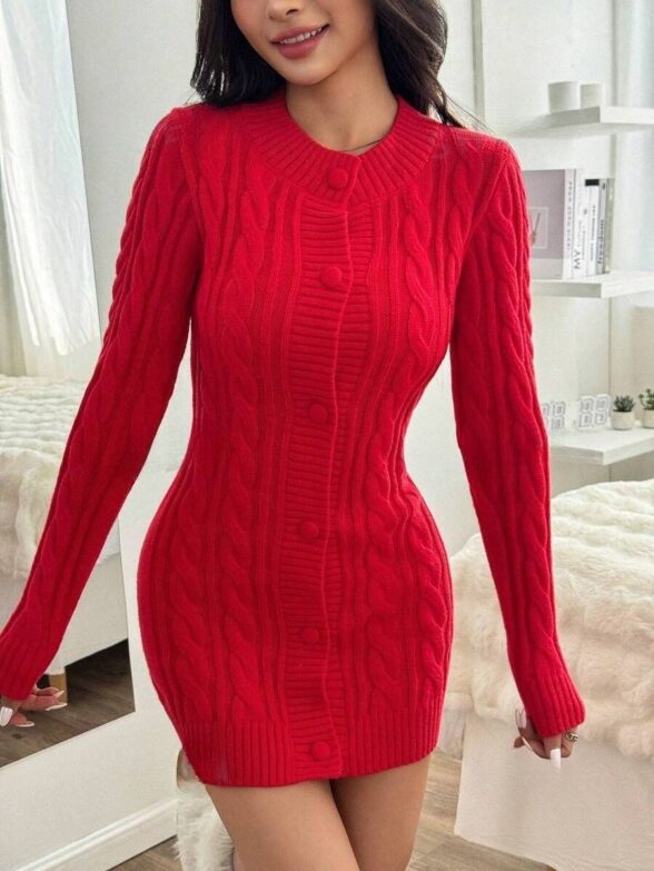 Rochie Scurta Tricotata Vanesia Rosie cu Nasturi