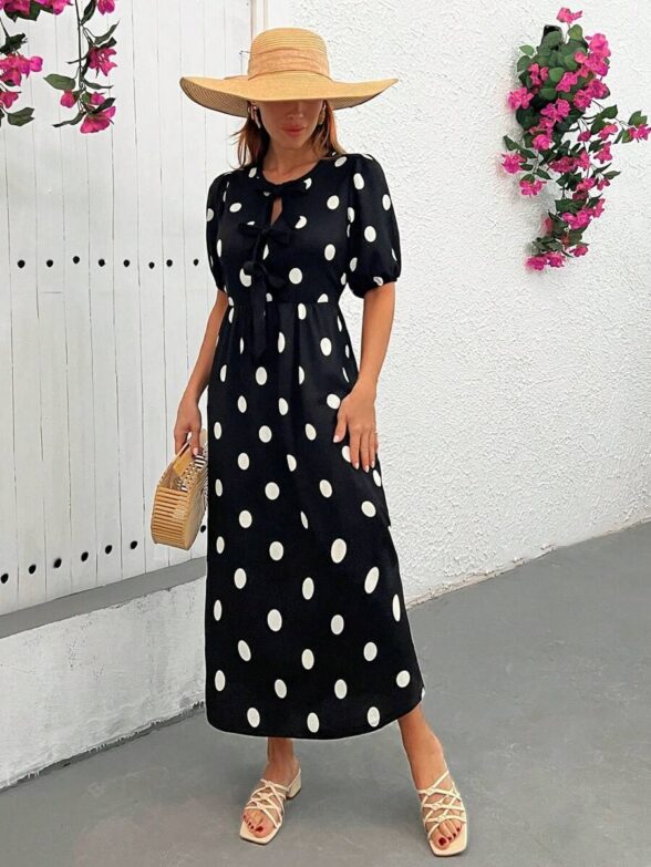 Rochie Lunga Bora Neagra Cu Buline Albe
