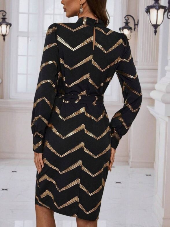 Rochie Scurta Solvita Neagra Cu Print Geometric Auriu