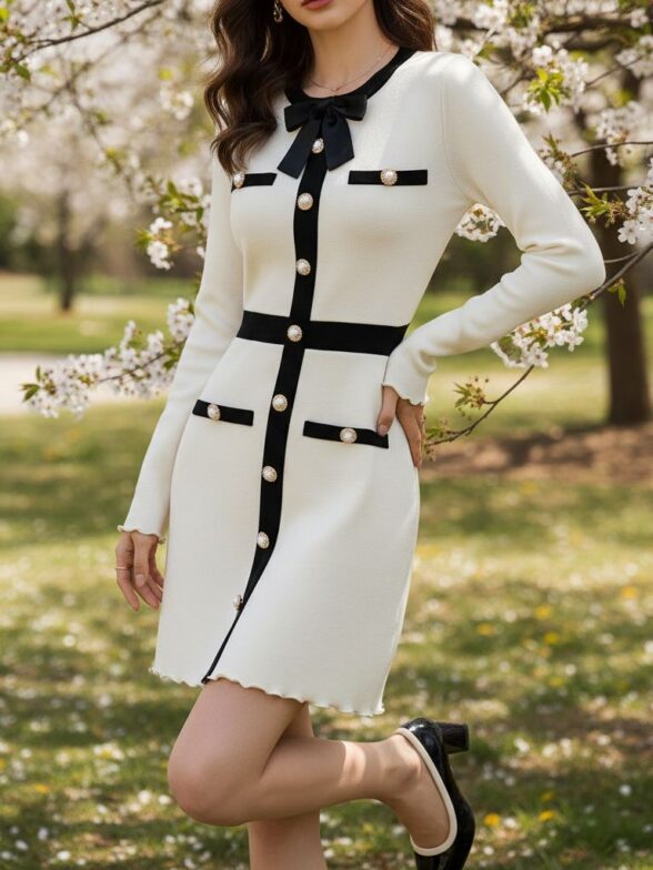 Rochie Tricotata Scurta Nisen Alba Cu Dungi Negre