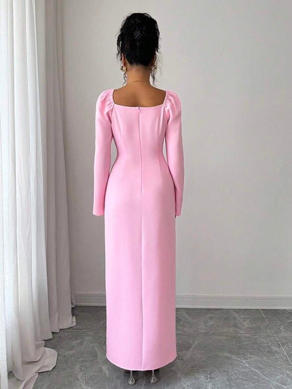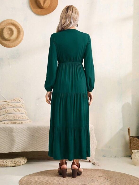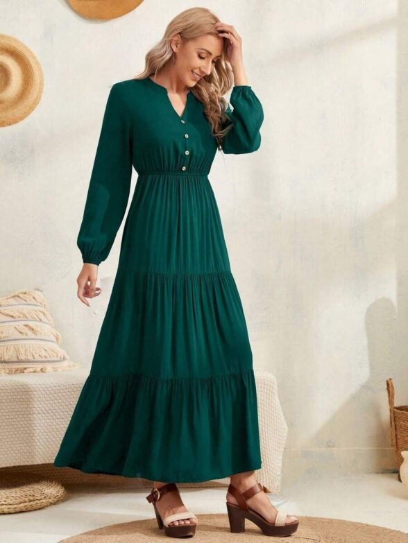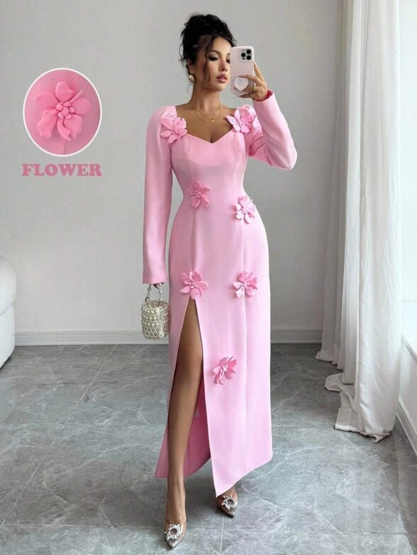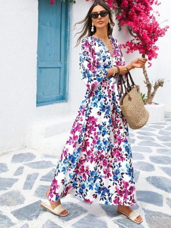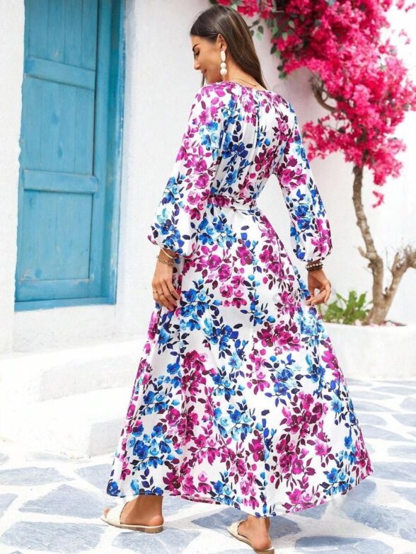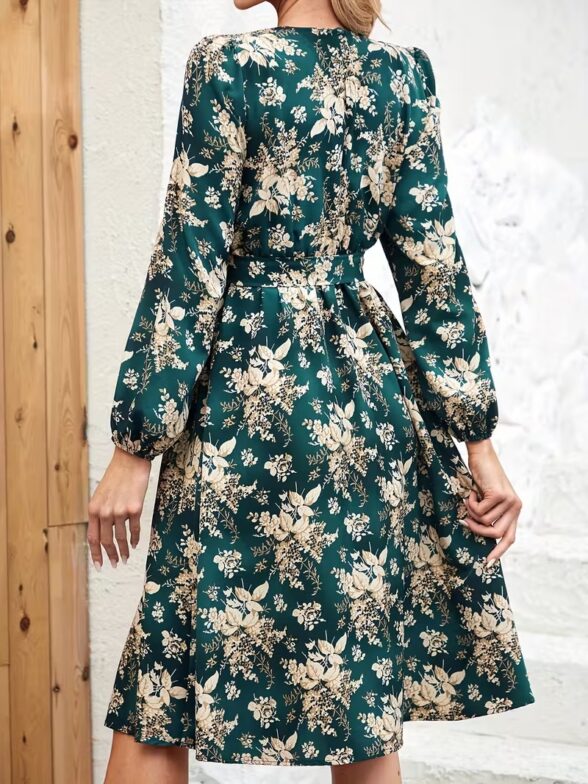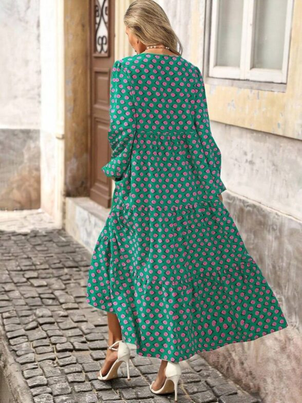 Rochie Lunga Simina Verde cu Print Floral Roz