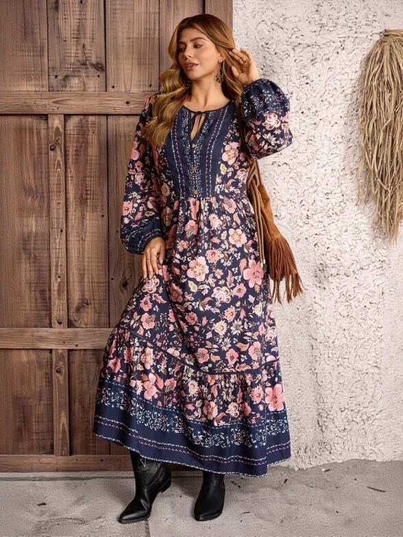 Rochie Lunga Taisa Bleumarin Inflorata – Marimi Mari