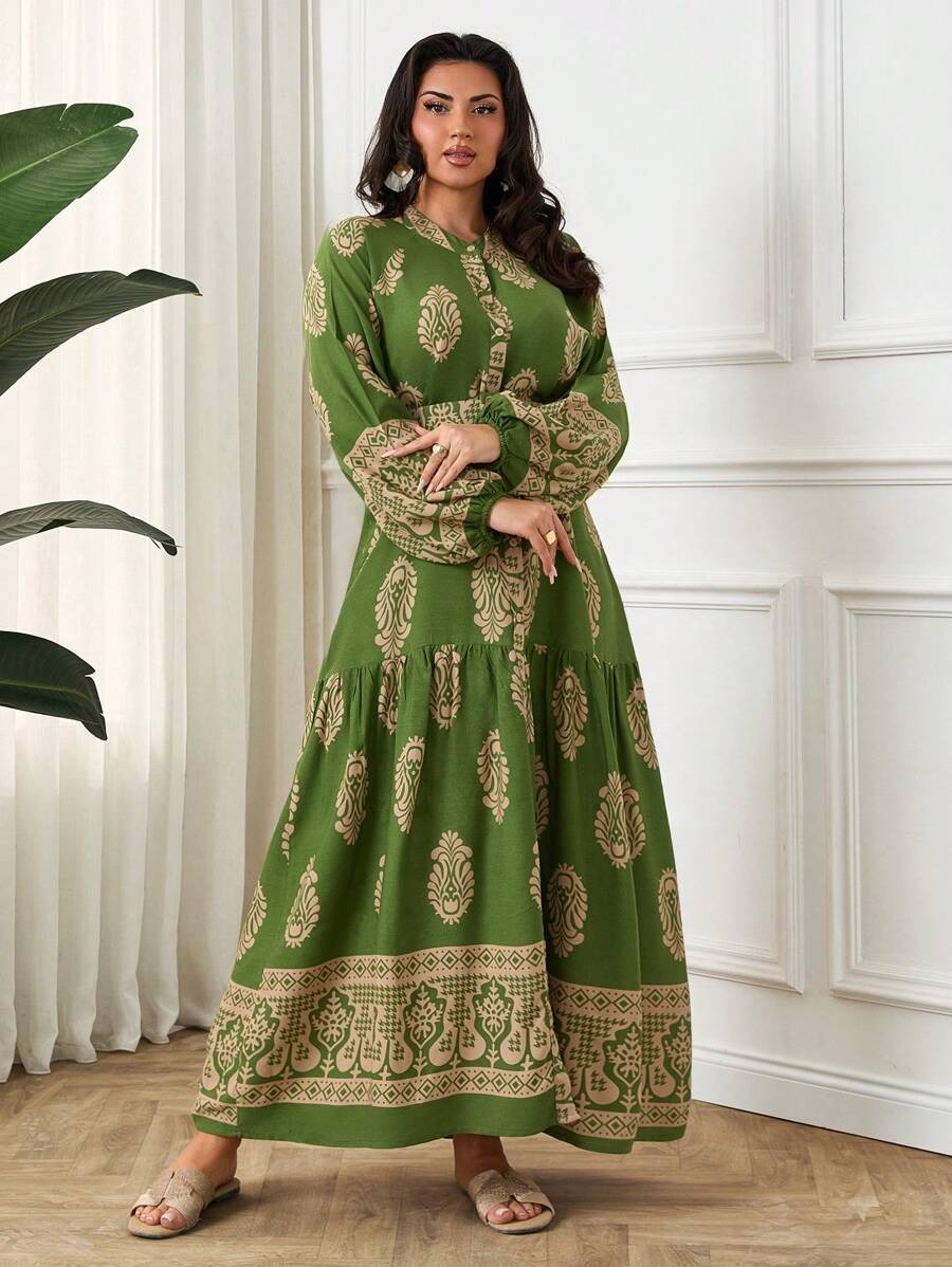 Rochie Lunga Minke Verde cu Print Bej