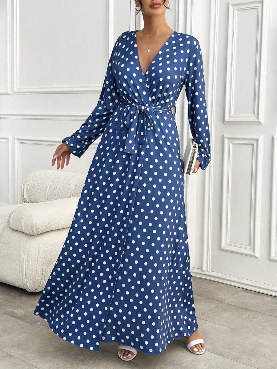 Rochie Lunga Castenia Albastra cu Buline Albe