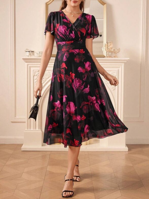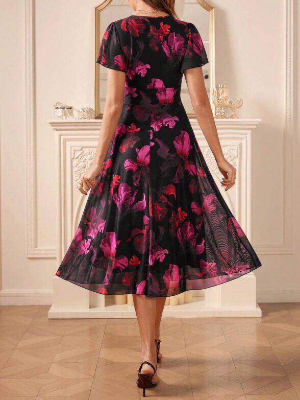 Rochie Midi Aurora Neagra cu Print Floral Rosu si Roz