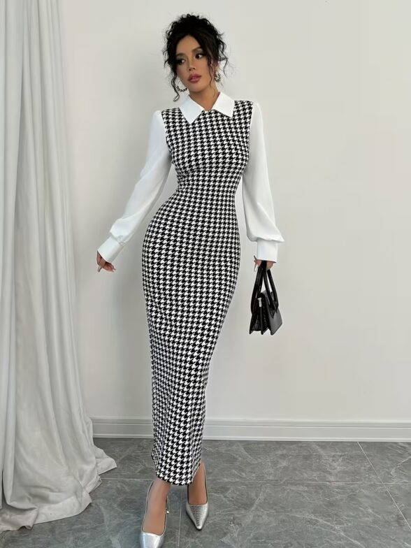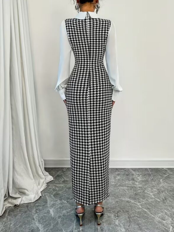 Rochie Lunga Castenia Alba cu Print Geometric Negru