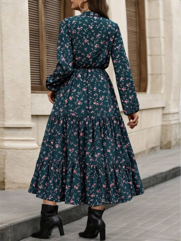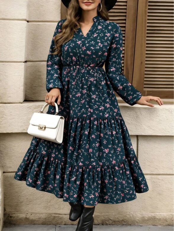 Rochie Lunga Cassie Turcoaz cu Print Floral Roz – Marimi Mari