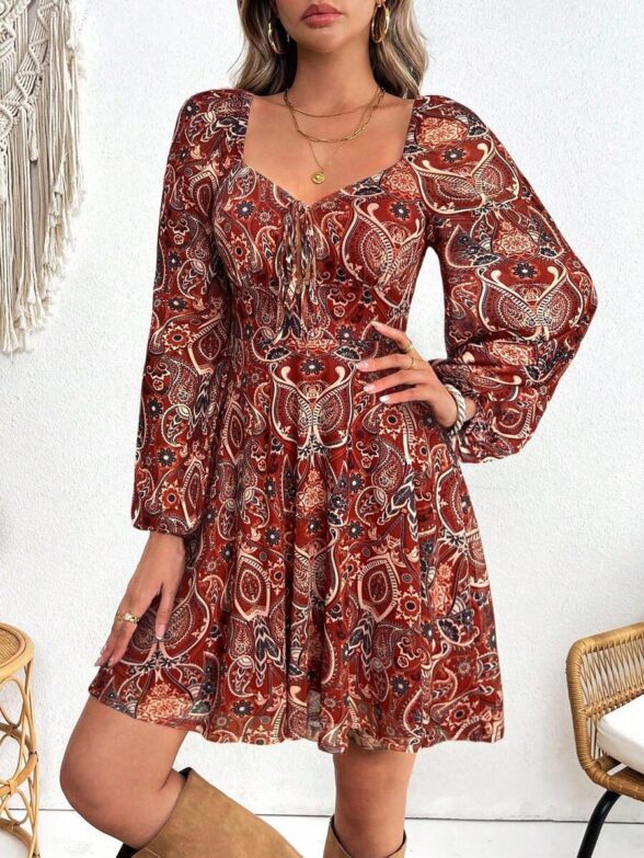 Rochie Scurta Sumaya Alba cu Print Geometric Negru si Maneci Albe