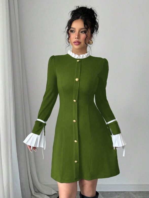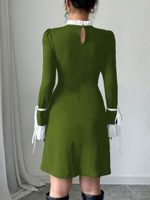 Rochie Scurta Melen Kaki cu Mansete Albe