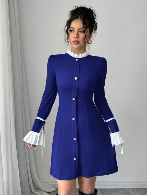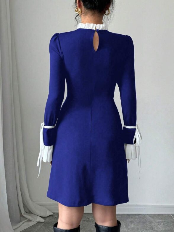 Rochie Scurta Melen Albastra cu Mansete Albe