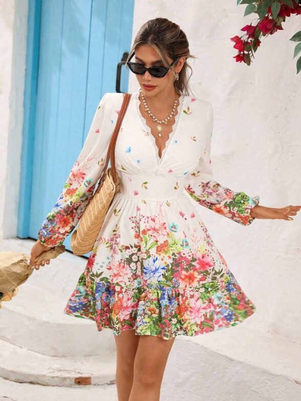 Rochie Scurta Delia Alba cu Print Floral Multicolor