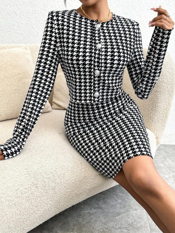 Compleu cu Rochie Scurta Helna Negru cu Print Alb
