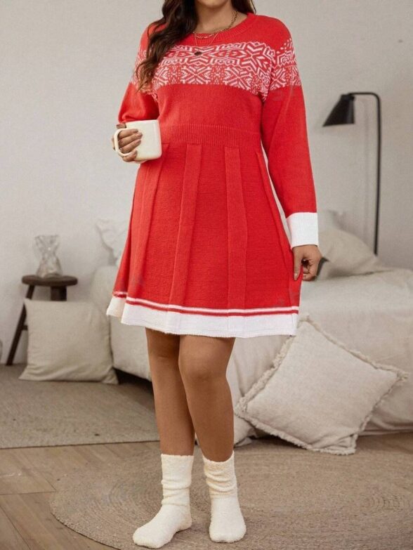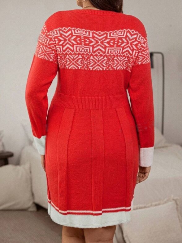 Rochie Tricotata Scurta Sumru Rosie cu Imprimeu de Craciun – Marimi Mari
