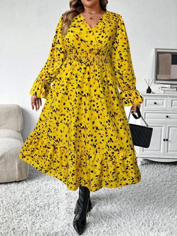 Rochie Midi Aletha Galbena cu Print Negru – Marimi Mari