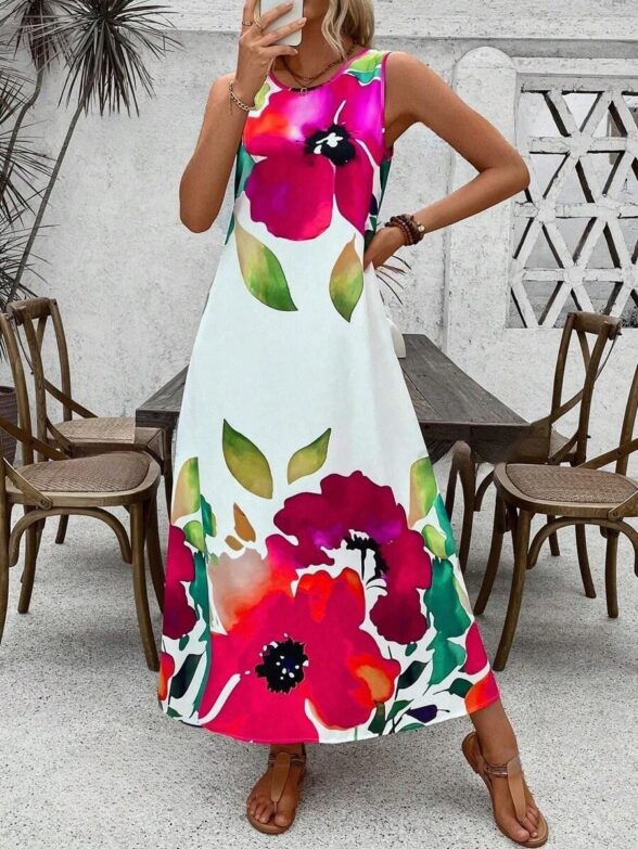 Rochie Lunga Amber Alba cu Print Floral Multicolor