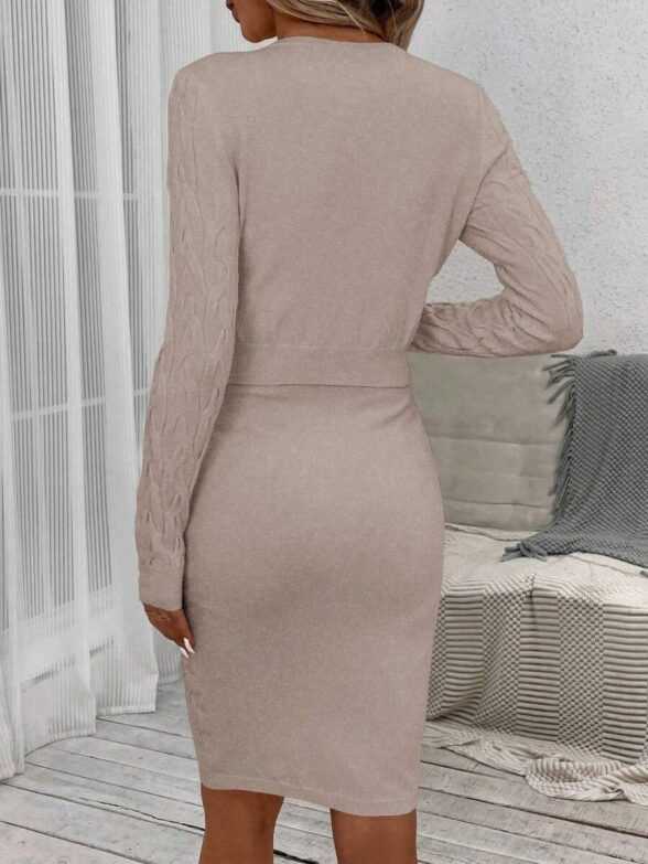 Compleu cu Rochie Scurta Tricotata Ashlyn Bej Inchis