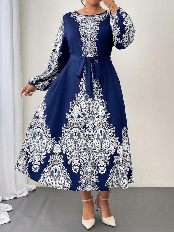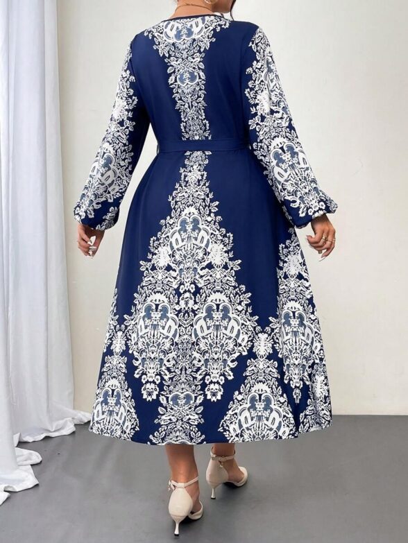 Rochie Midi Auvo Bleumarin cu Print Alb – Marimi Mari