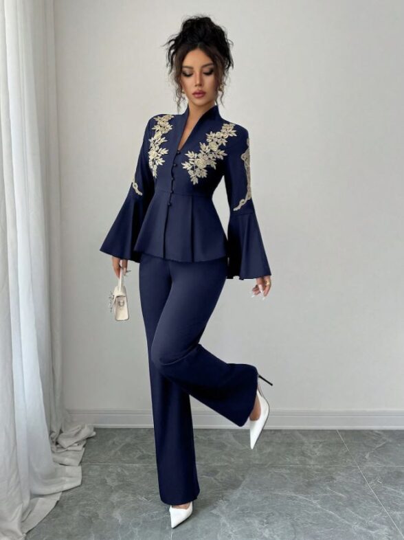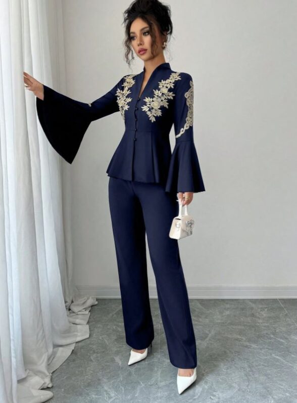 Compleu cu Pantalon Daniela Bleumarin cu Broderie Bej