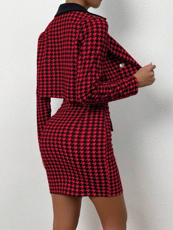 Compleu cu Rochie Scurta Polina Rosu cu Print Geometric Negru