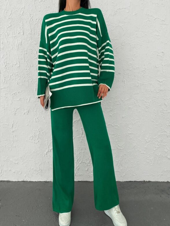 Compleu Tricotat cu Pantalon Suzan Verde cu Dungi Albe