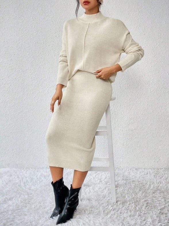 Compleu Tricotat cu Fusta Midi Irina Crem