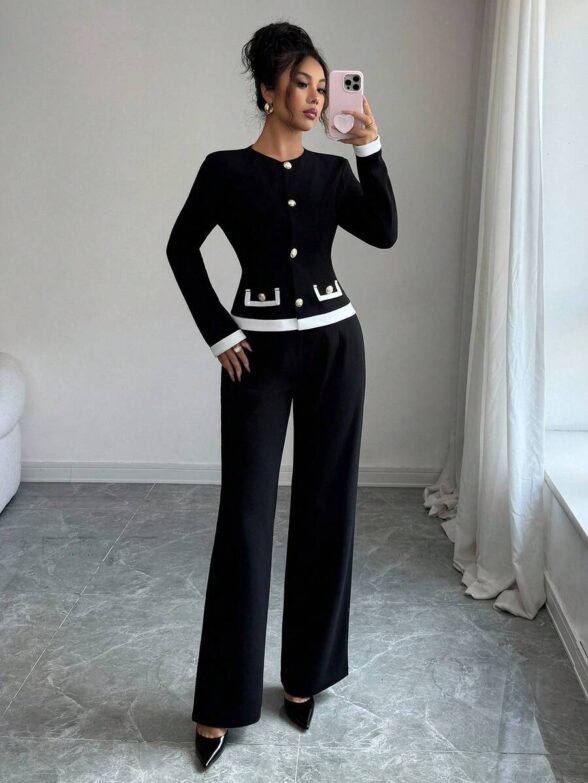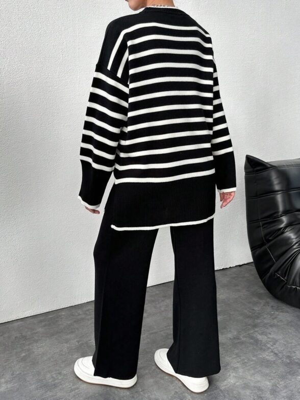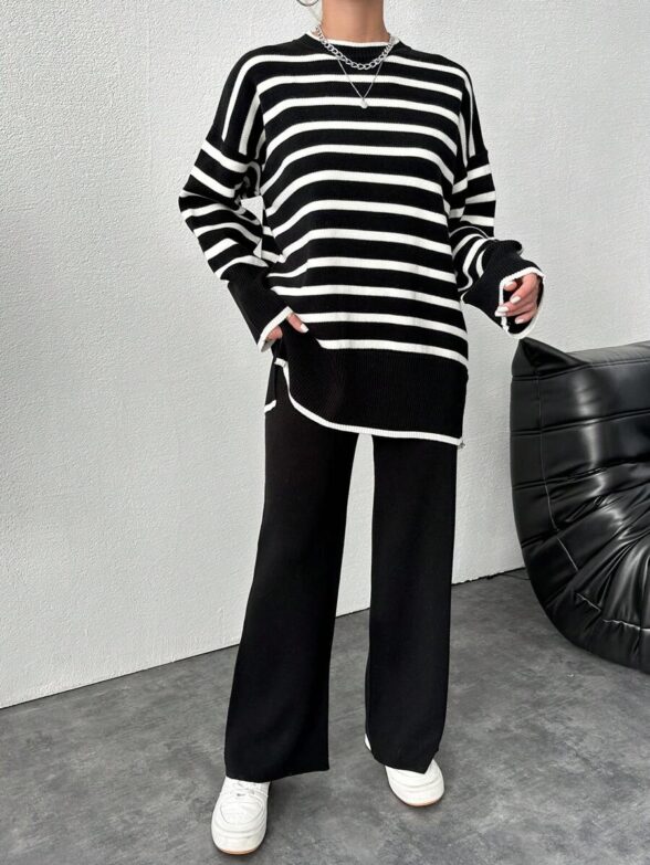 Prețul inițial a fost: 309,00 lei.123,60 leiPrețul curent este: 123,60 lei.Compleu Tricotat cu Pantalon Simona Negru cu Dungi Albe