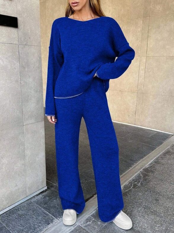 Compleu Tricotat cu Pantalon Zandra Albastru – Marimi Mari