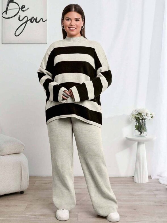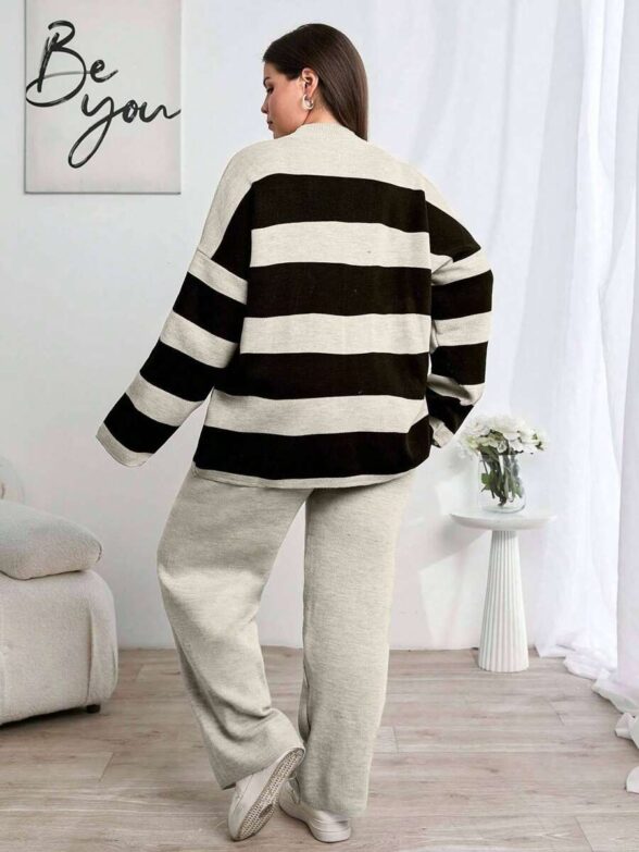 Compleu Tricotat cu Pantalon Eniko Gri cu Dungi Negre – Marimi Mari