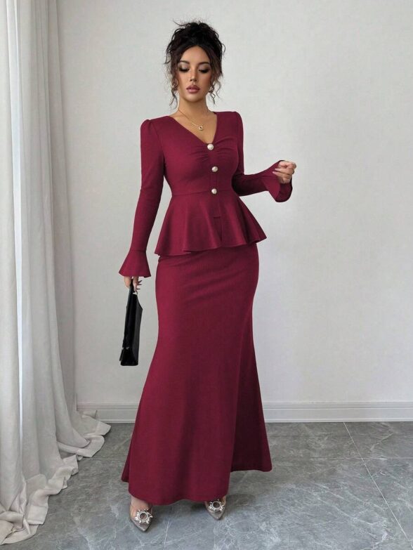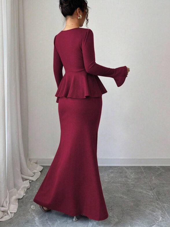 Compleu Tricotat cu Fusta Lunga Nieve Rosu