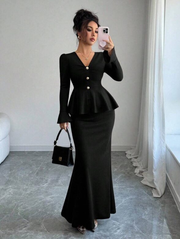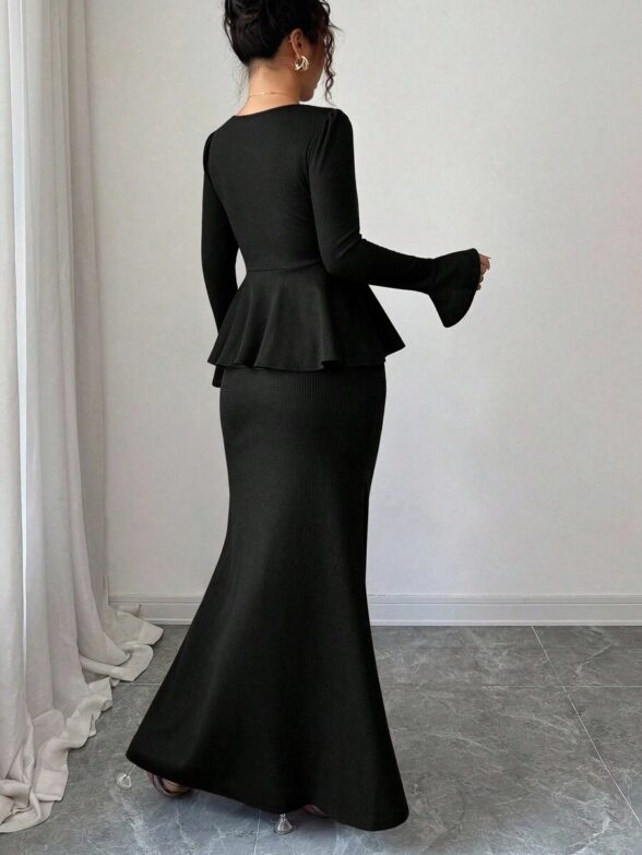 Compleu Tricotat cu Fusta Lunga Nieve Bleumarin