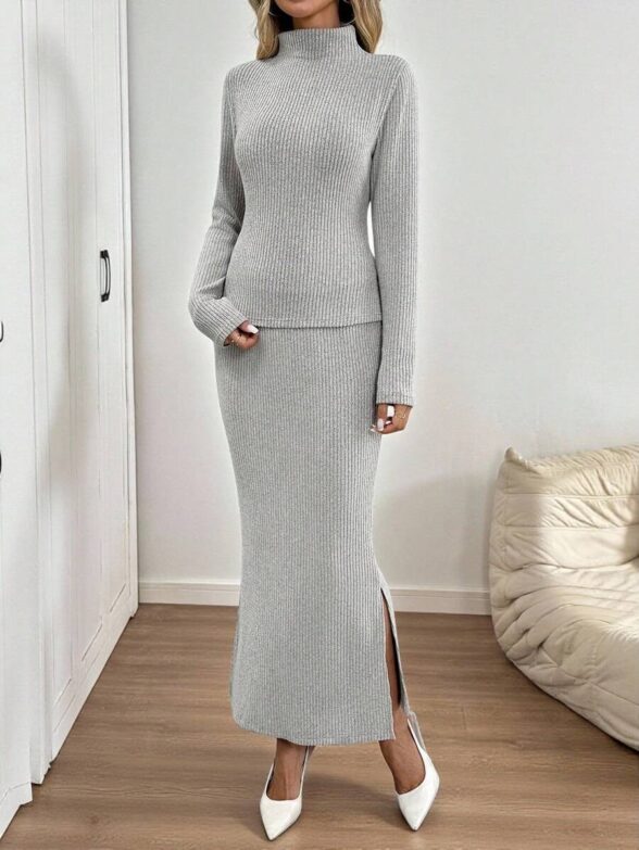 Compleu Tricotat cu Fusta Lunga Corina Bej