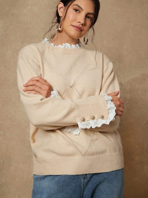 Pulover Tricotat Sarconi Bej cu Broderie – Marimi Mari