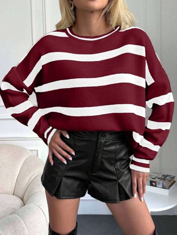 Pulover Tricotat Benned Alb cu Dungi Grena