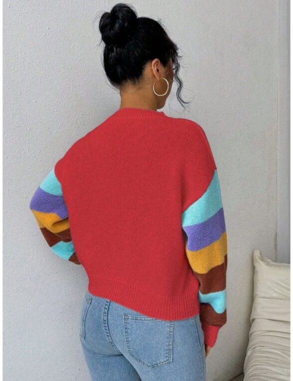 Pulover Tricotat Denisa Rosu cu Dungi Multicolore