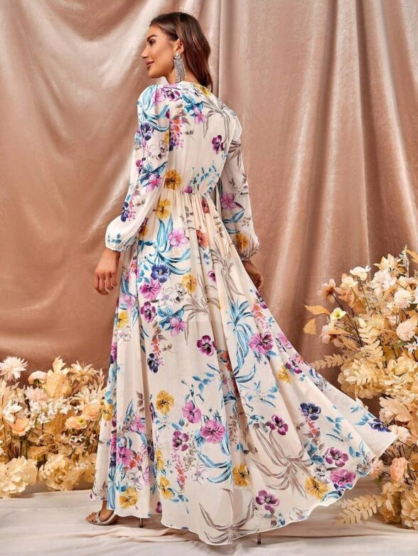 Rochie Lunga Didina Alba cu Flori Multicolore