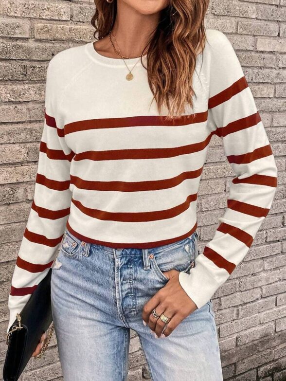 Pulover Tricotat Kayla Alb cu Dungi Grena