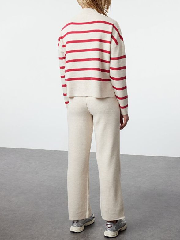 Compleu Tricotat cu Pantalon Calypso Bej cu Dungi Roz