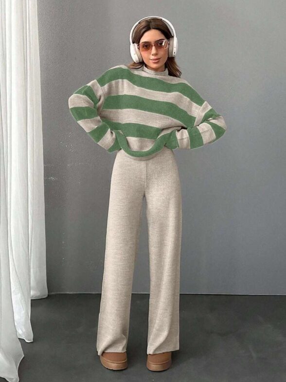 Compleu Tricotat cu Pantalon Madlen Bej cu Dungi Vernil